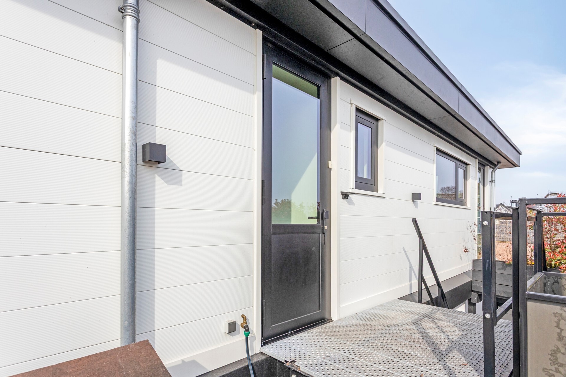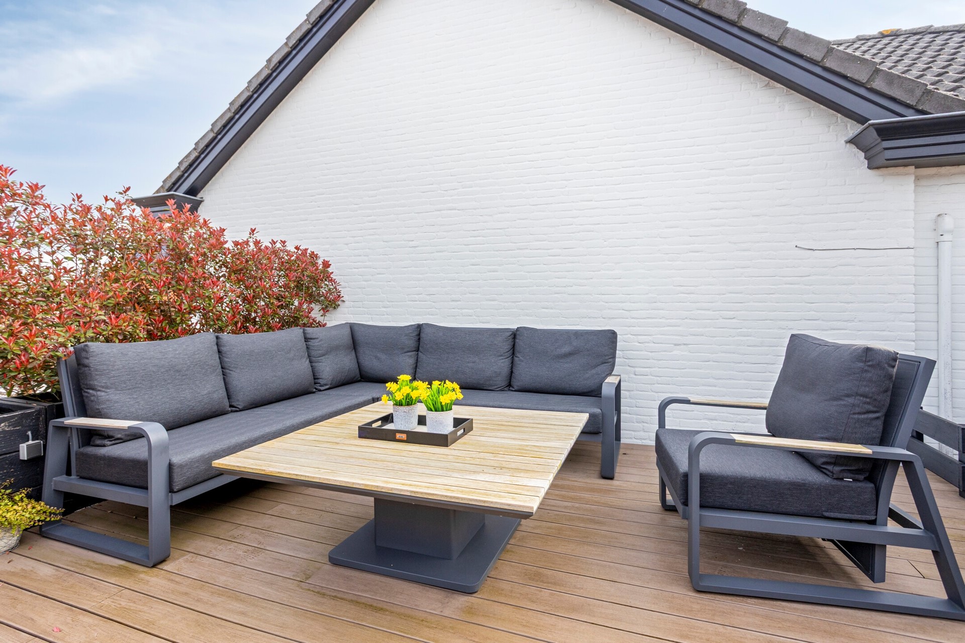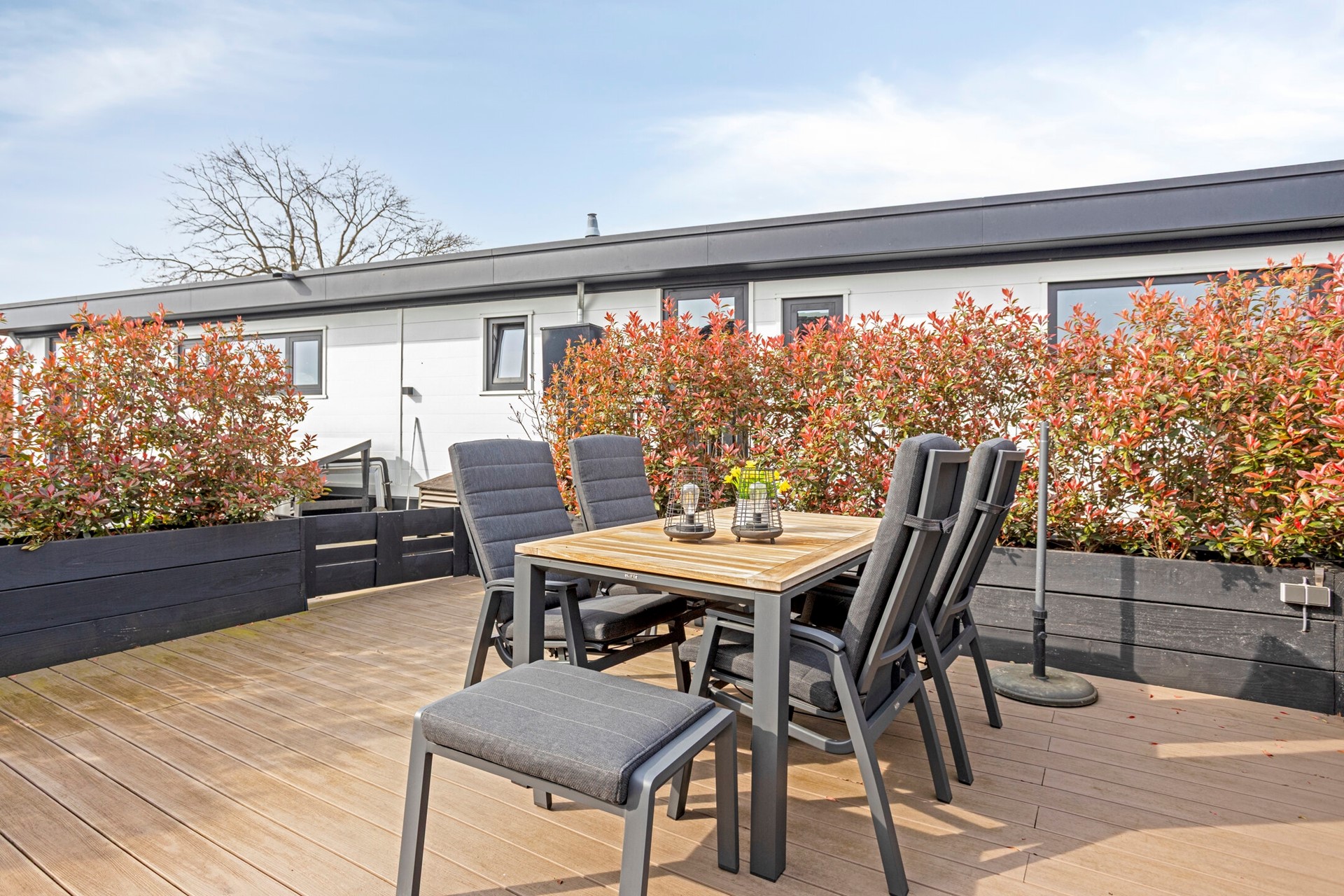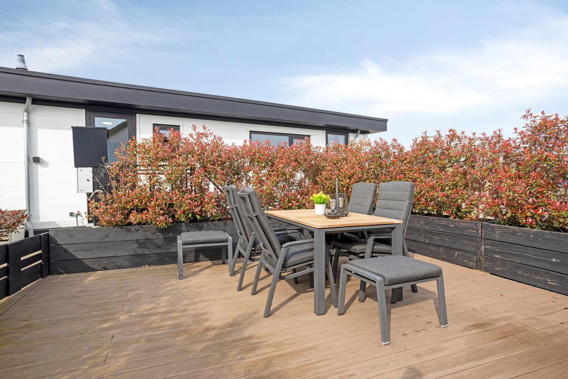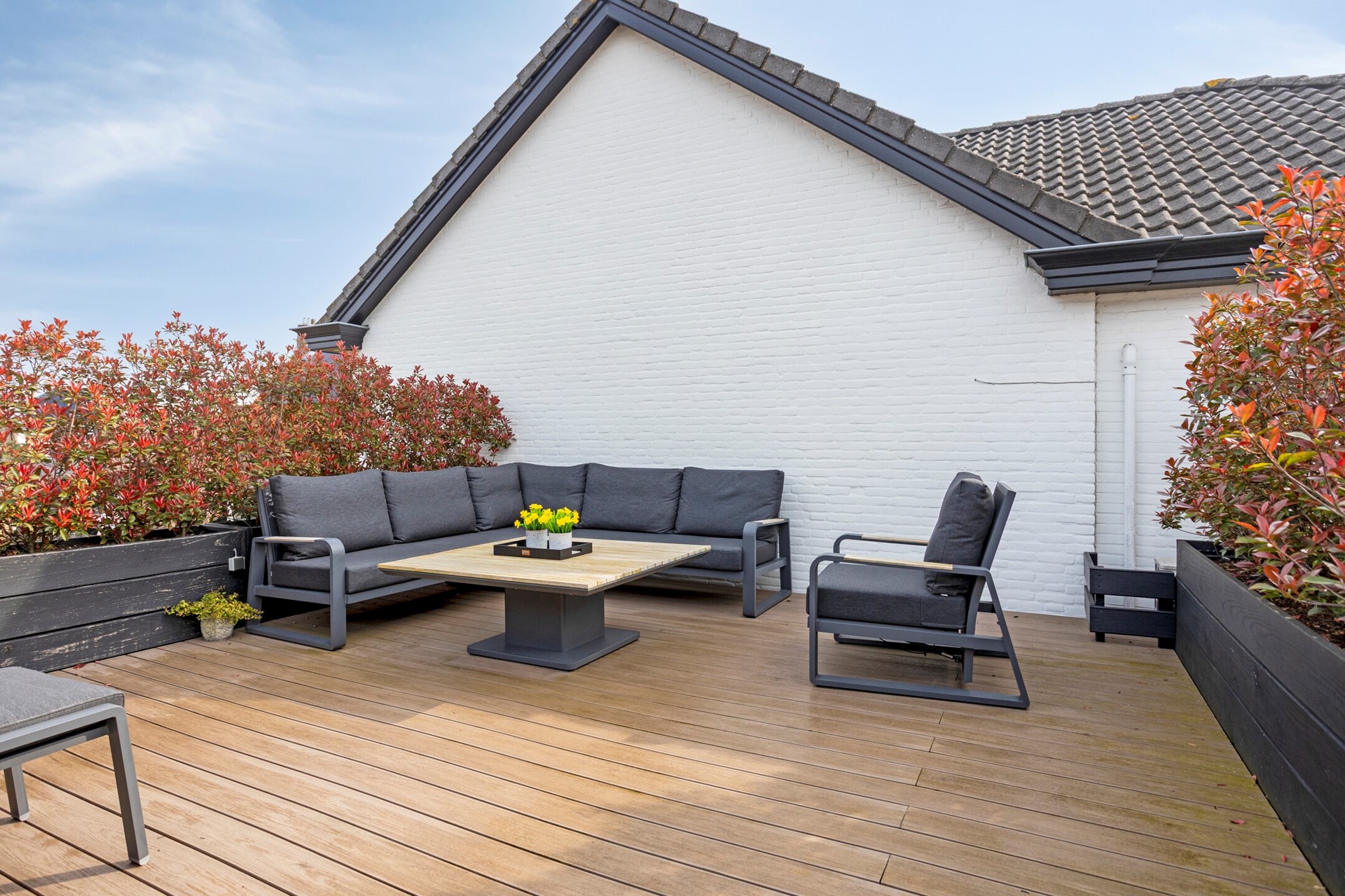 • Het dakterras: dit royale terras ligt aan de Dreef en heerlijk zongunstig op zuid. Het terras is rondom afgezet met plantenbakken met hierin groenblijvende struiken die het gehele jaar door zorgen voor maximale privacy op dit terras. Het terras is afgewerkt met een vlonder.