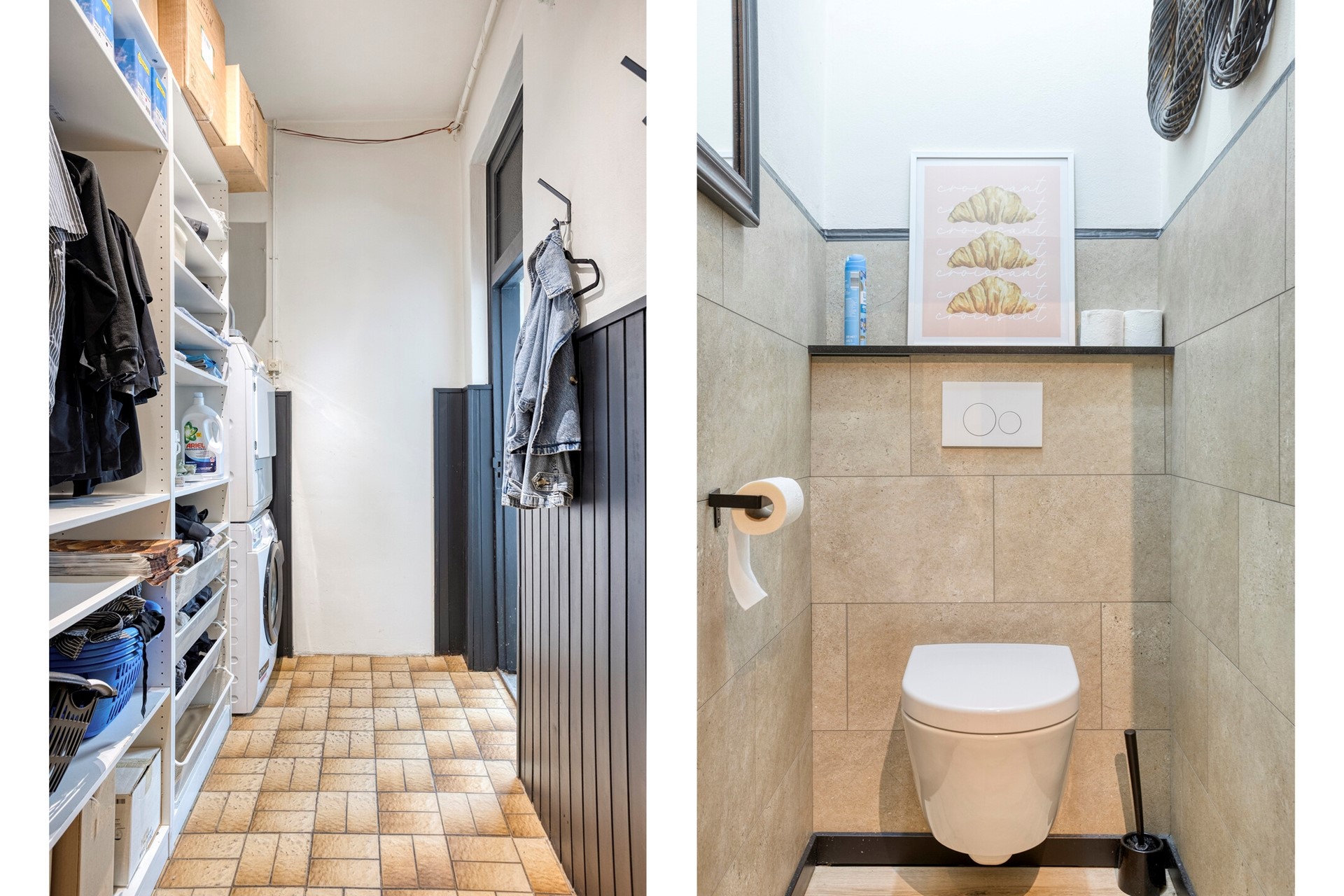 • Gang met bergruimte met fraaie houten loftdeur en een toiletruimte met deels betegelde wanden met wandcloset
