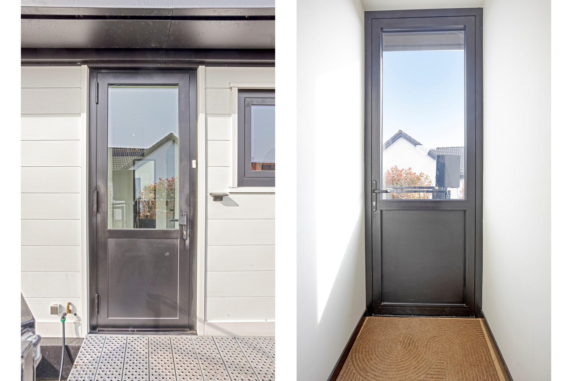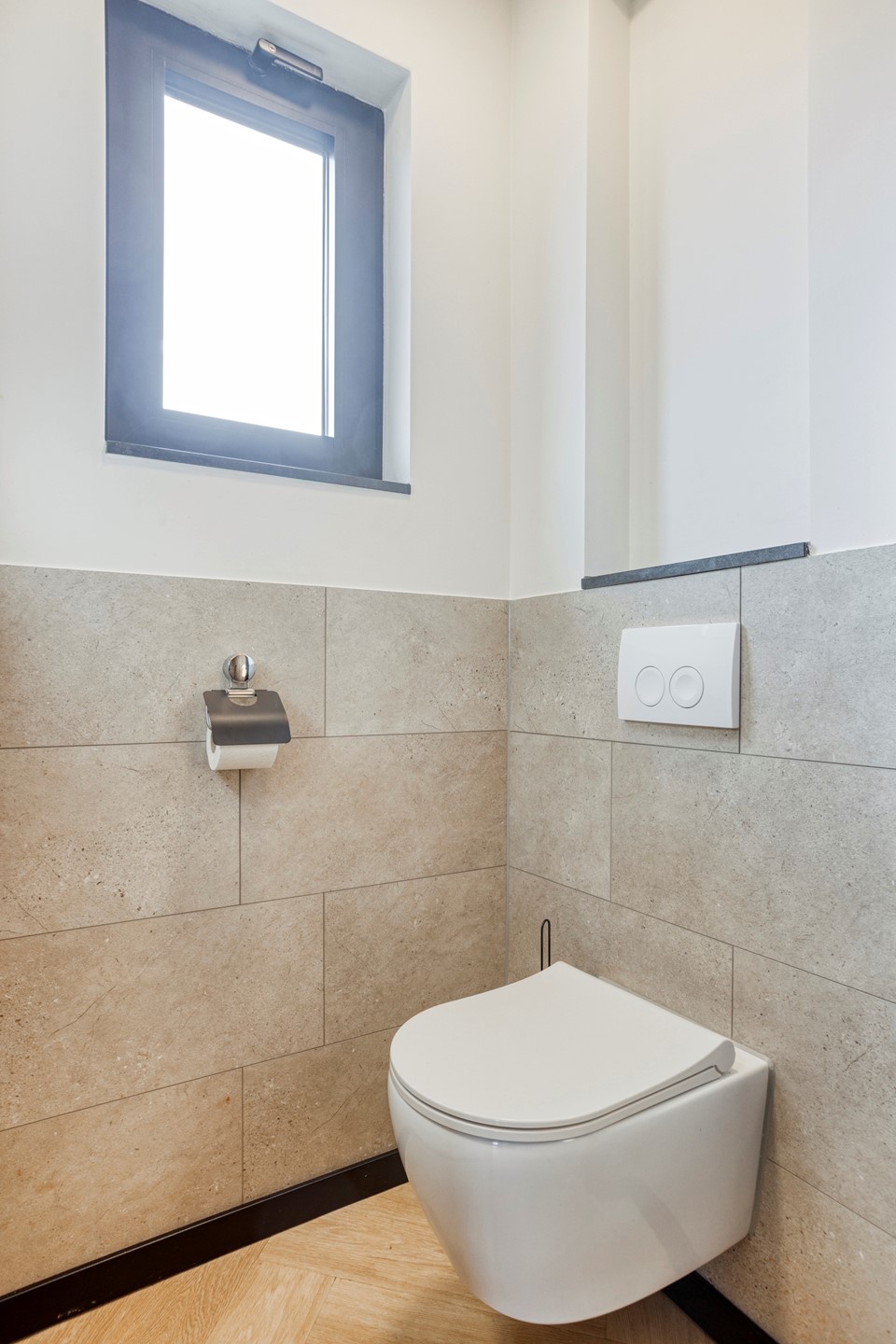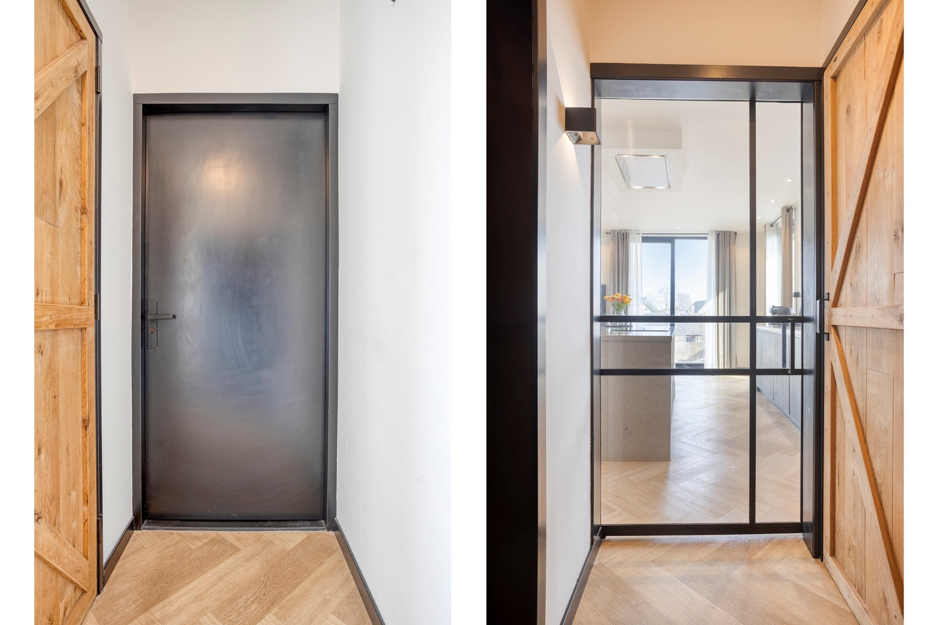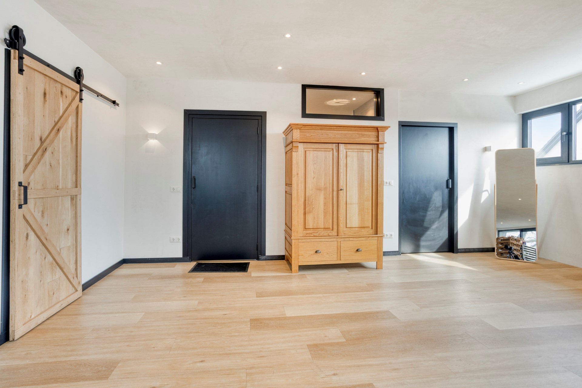 • T-vormige ontvangsthal met rechts toegang tot de toiletruimte, aansluitend een ruime vaste kast en industriële ogende schuifdeur met glaszetting naar de woonkamer.