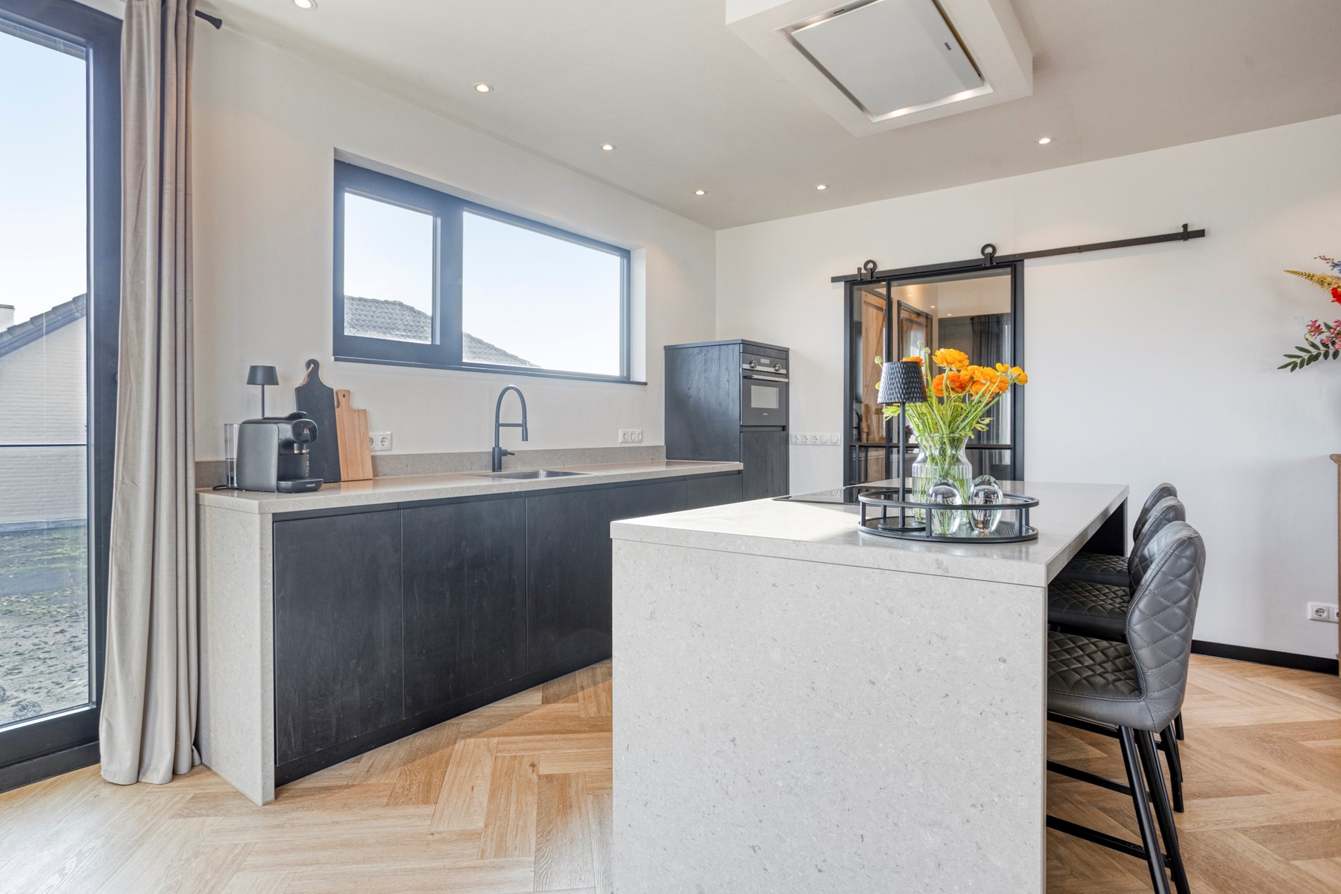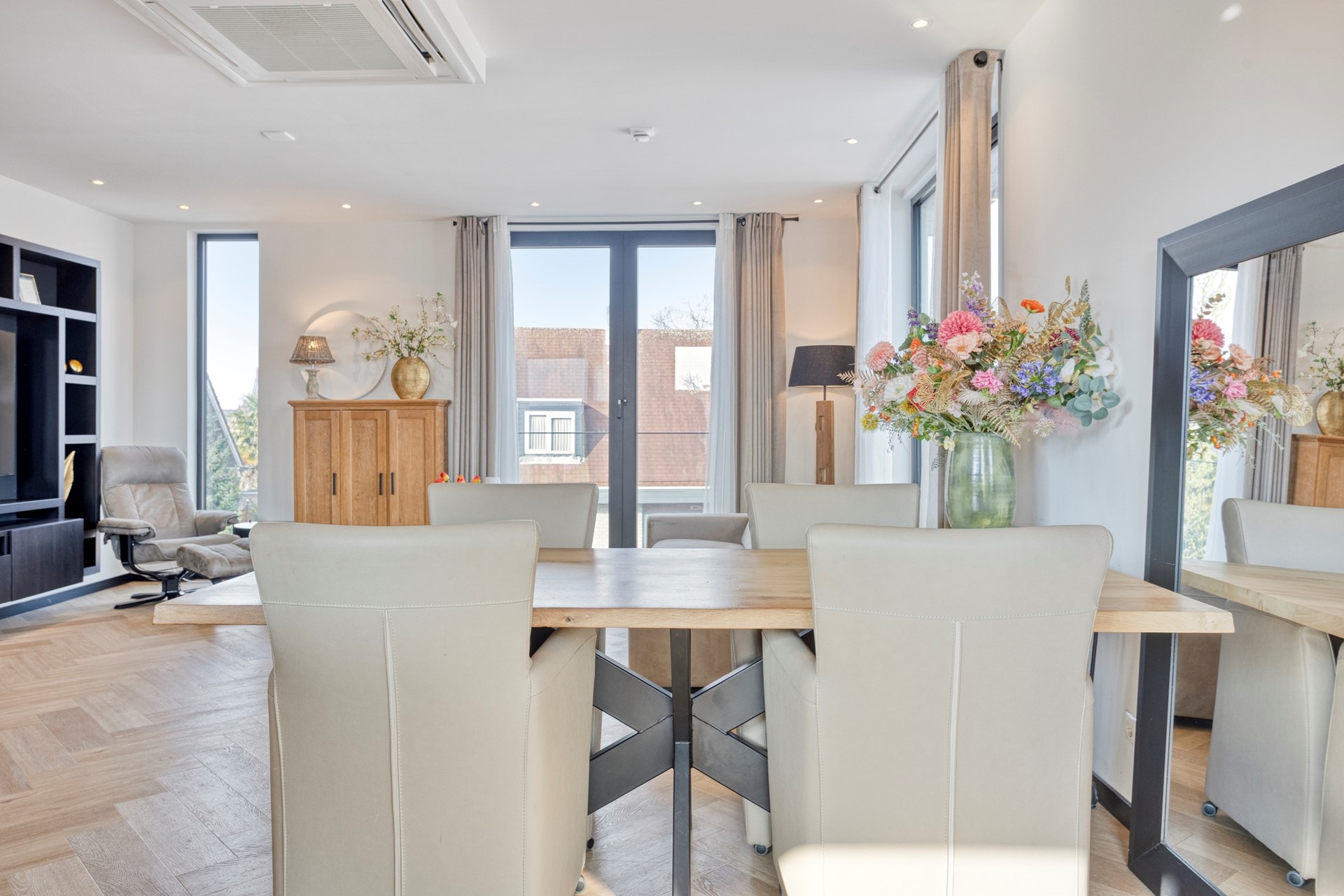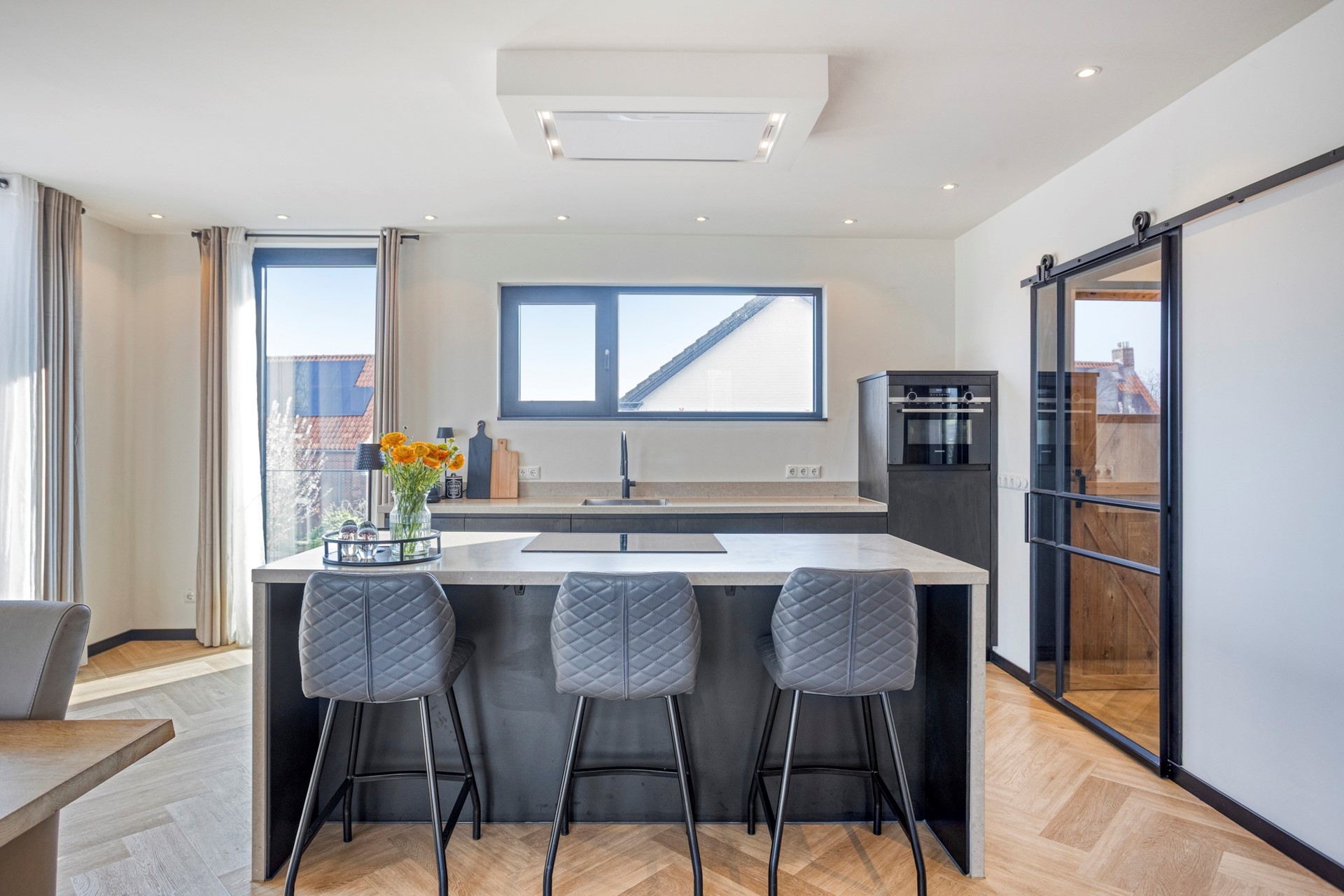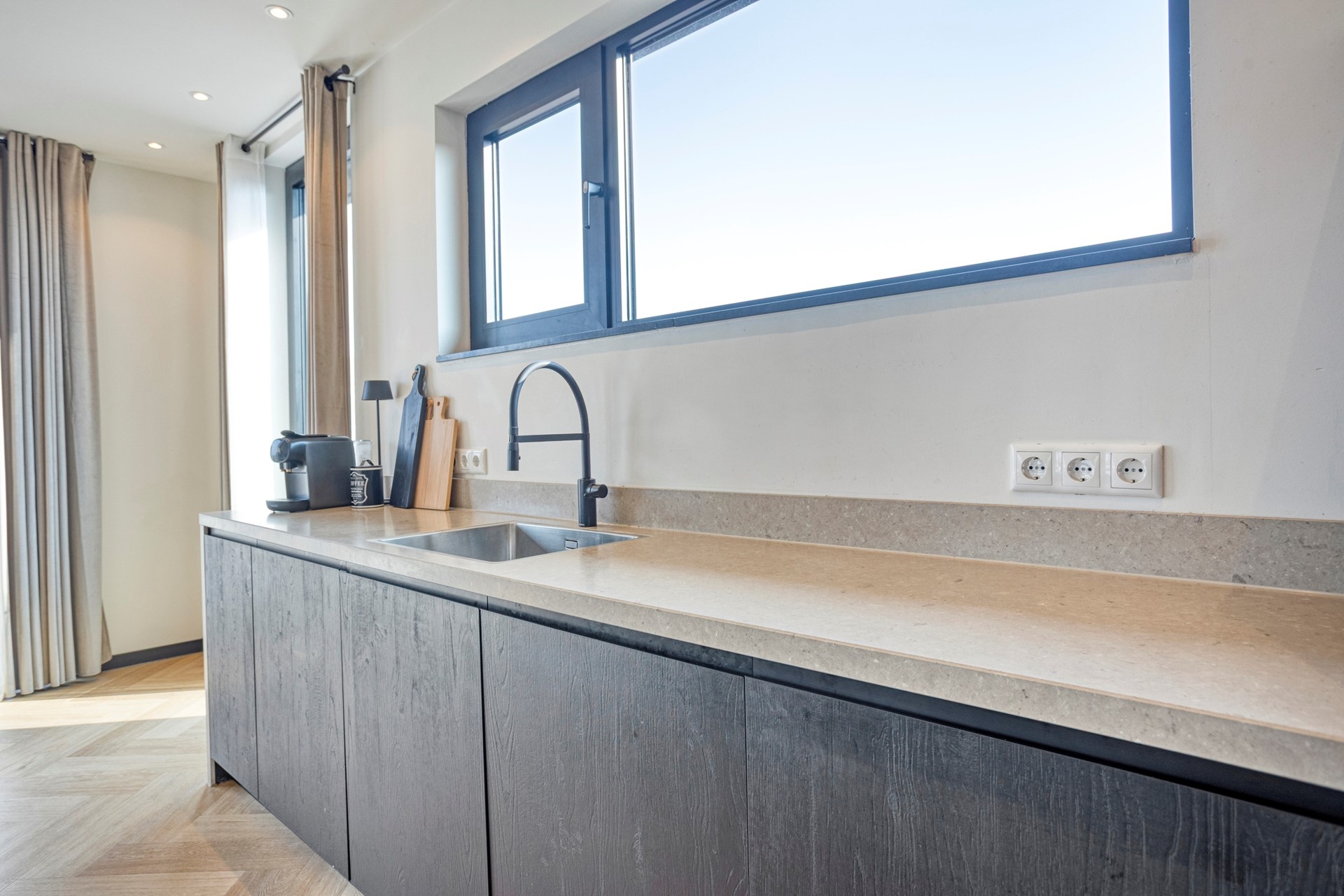 • De sfeervolle woonkamer met open keuken heeft een 2-tal Franse balkons. De overige ramen (die overigens tot aan de vloer doorlopen) zorgen voor extra veel lichtinval. Deze ruimte is voorzien van een airco die zorgt voor de verwarming of koeling van deze ruimte (in het penthouse zitten totaal een 4-tal airco’s voor verwarming of koeling van diverse ruimtes). In de badkamer zit een radiator. De keukenopstelling: modern en exclusief keukenblok met kookeiland met bar beide voorzien van een composiet werkblad. De keuken heeft o.a. meerdere laden en geïntegreerde (Siemens) apparatuur zoals: combimagnetron, inductiekookplaat, afzuigkap (in plafond verwerkt), vaatwasser, koelkast en vriezer. In de woonkamer een duurzame en fraaie pvc-vloer gelegd in visgraatmotief. Deze vloer loopt geheel door over dit deel van het penthouse.