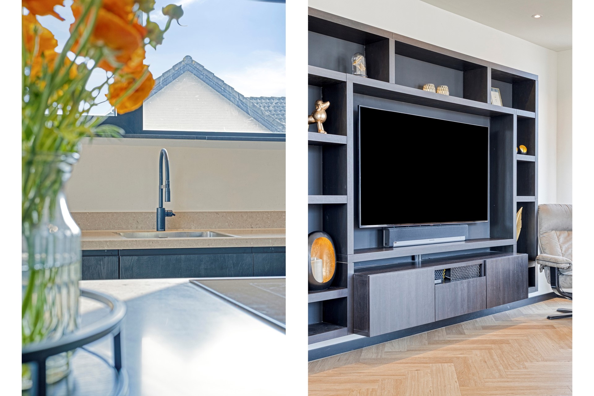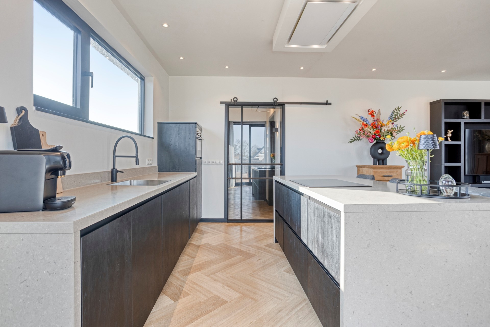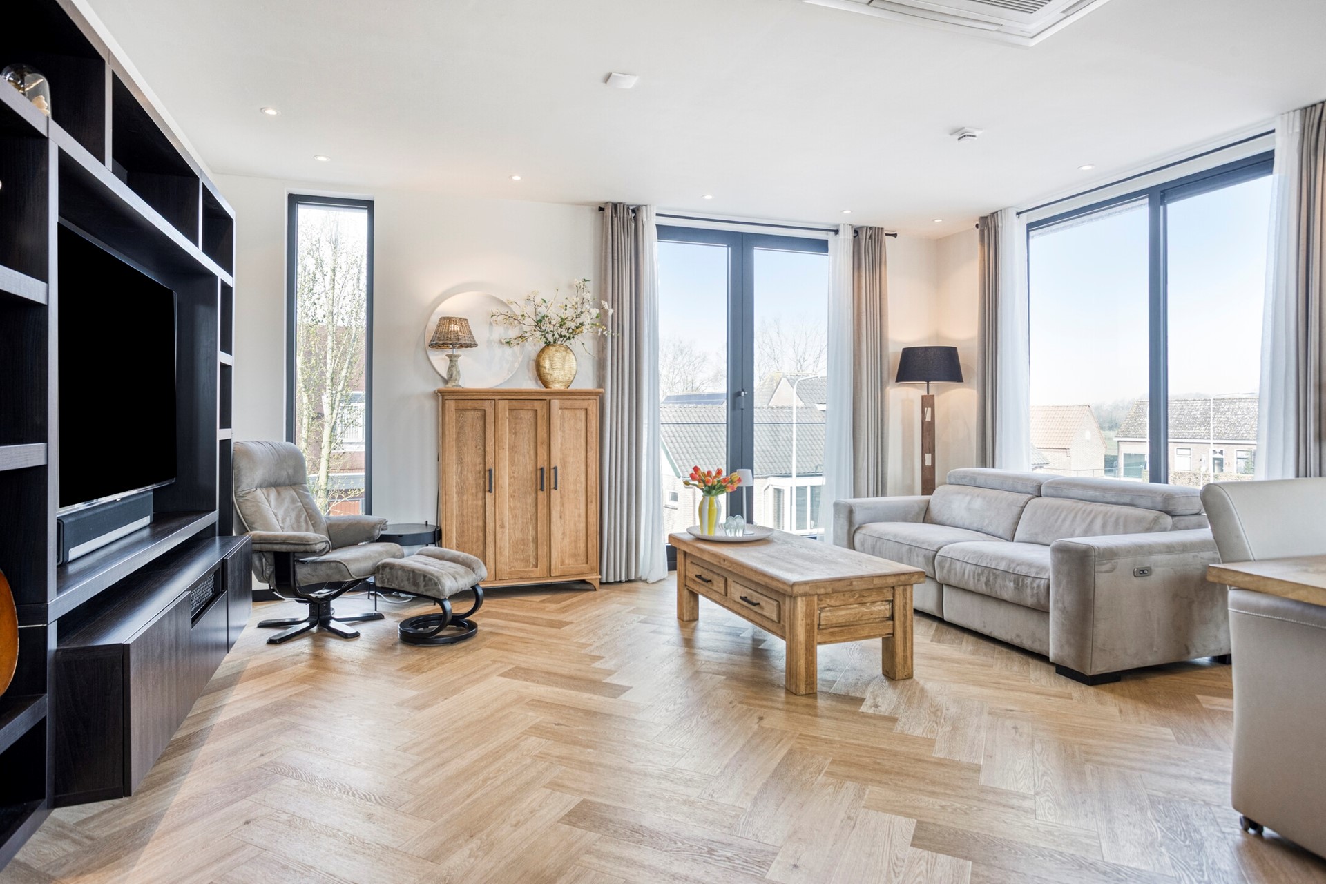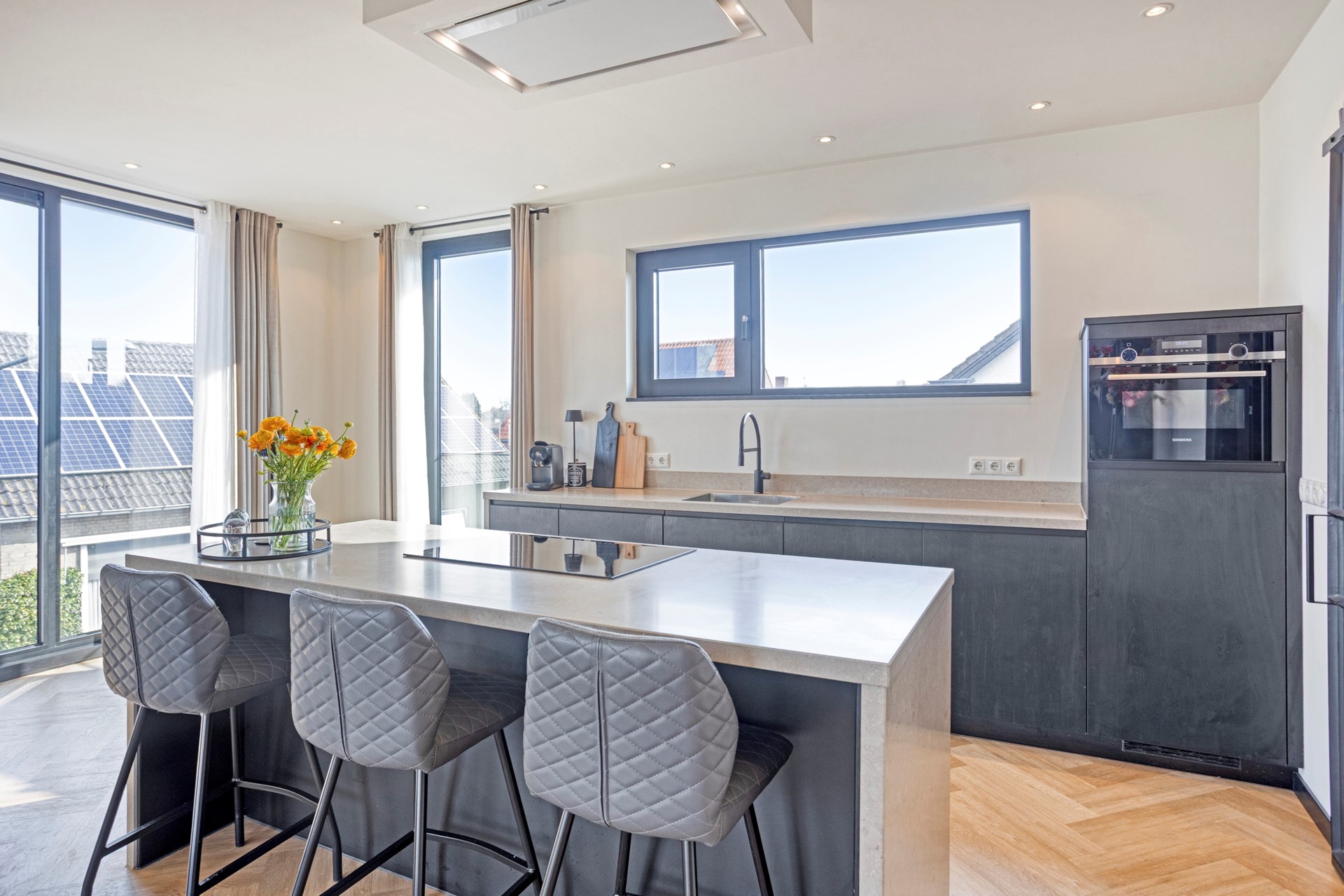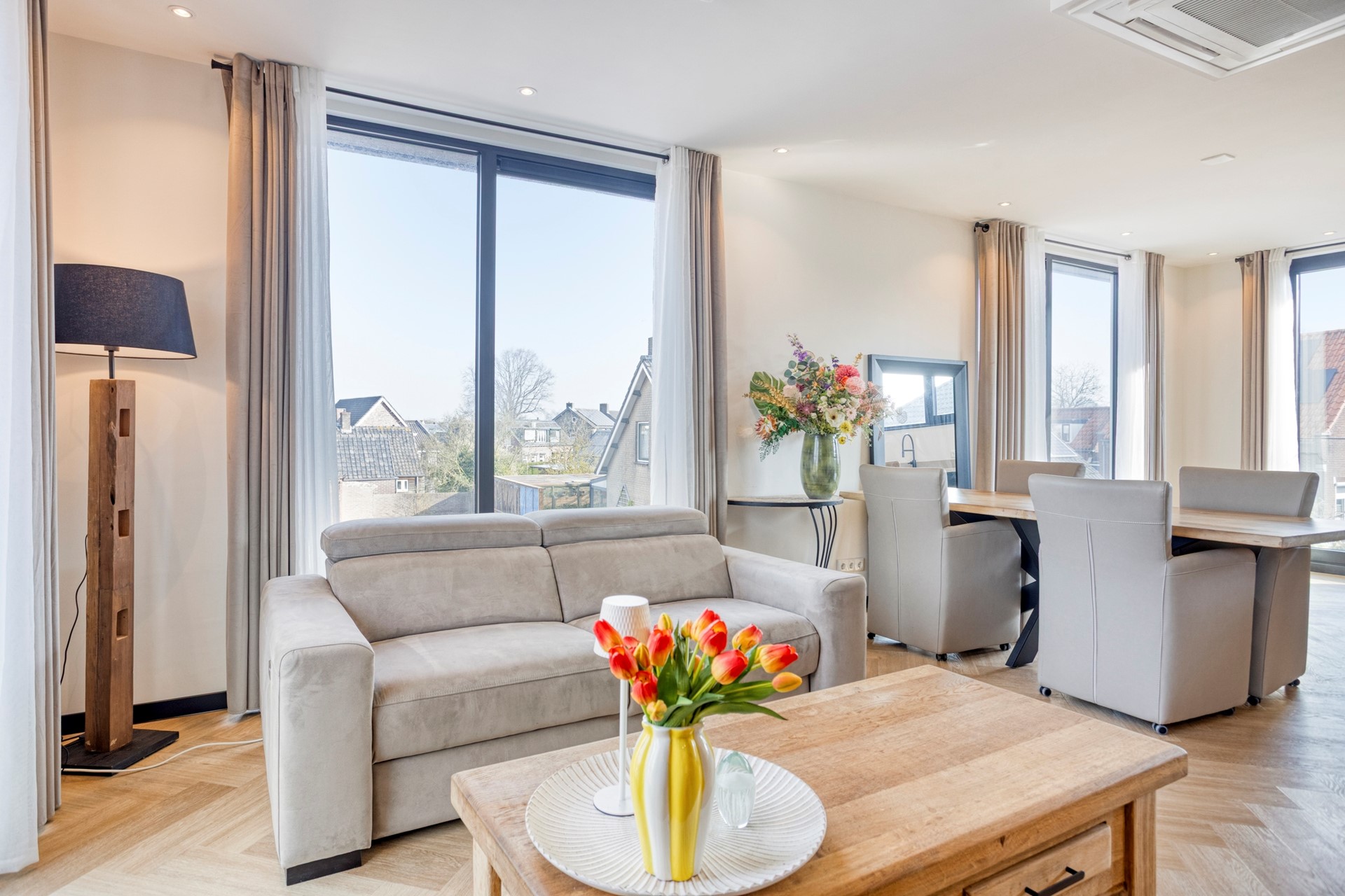 • De sfeervolle woonkamer met open keuken heeft een 2-tal Franse balkons. De overige ramen (die overigens tot aan de vloer doorlopen) zorgen voor extra veel lichtinval. Deze ruimte is voorzien van een airco die zorgt voor de verwarming of koeling van deze ruimte (in het penthouse zitten totaal een 4-tal airco’s voor verwarming of koeling van diverse ruimtes). In de badkamer zit een radiator. De keukenopstelling: modern en exclusief keukenblok met kookeiland met bar beide voorzien van een composiet werkblad. De keuken heeft o.a. meerdere laden en geïntegreerde (Siemens) apparatuur zoals: combimagnetron, inductiekookplaat, afzuigkap (in plafond verwerkt), vaatwasser, koelkast en vriezer. In de woonkamer een duurzame en fraaie pvc-vloer gelegd in visgraatmotief. Deze vloer loopt geheel door over dit deel van het penthouse.