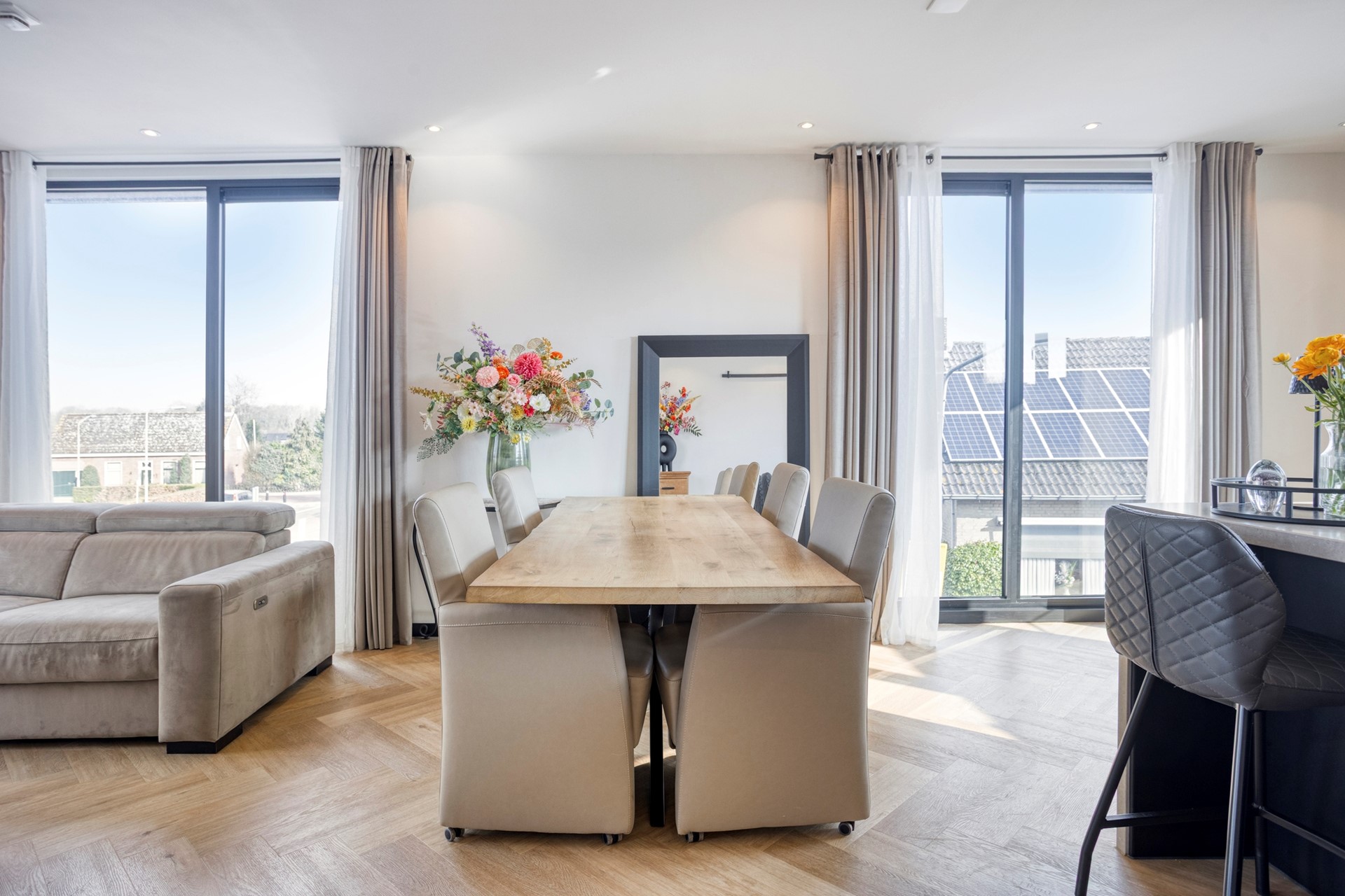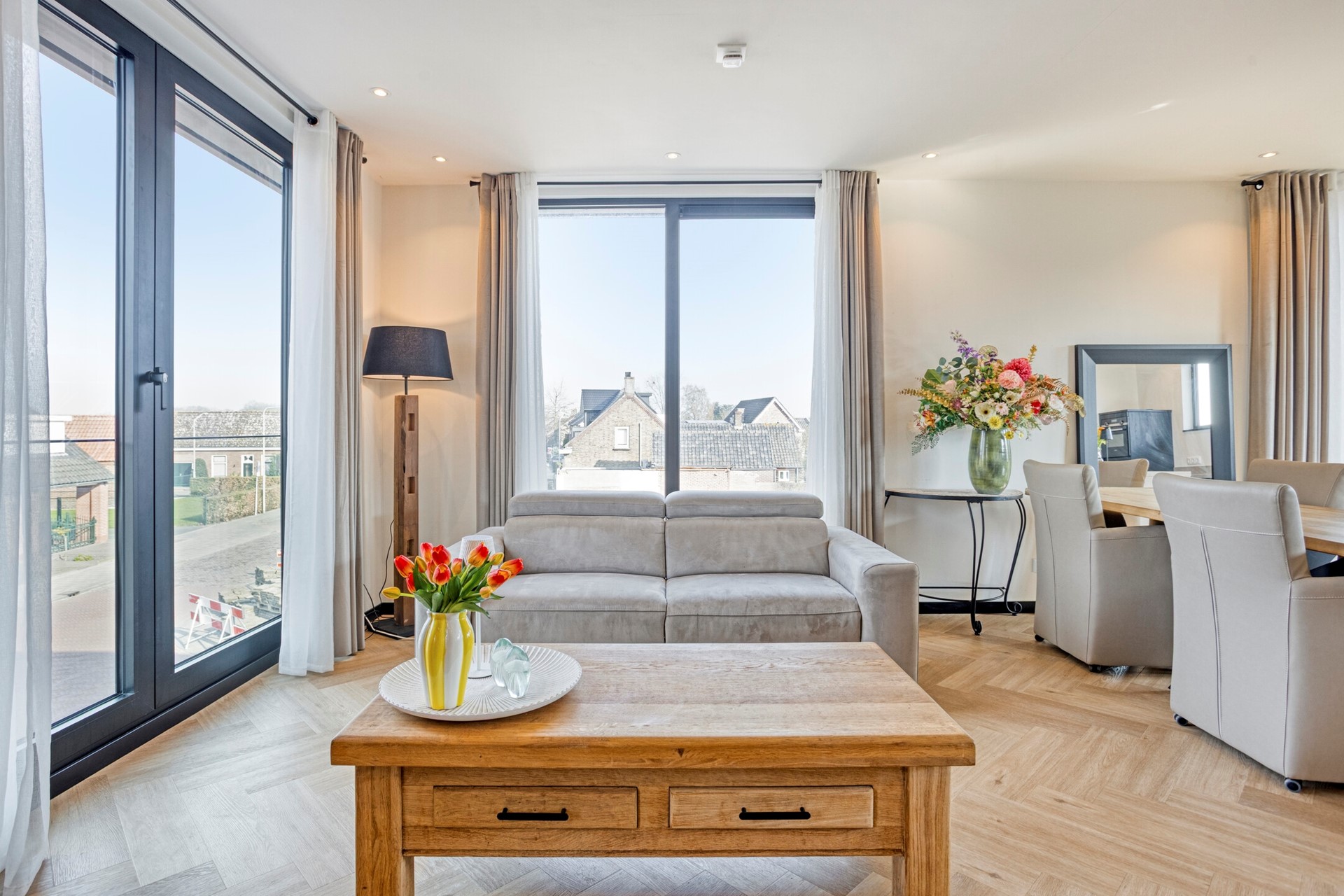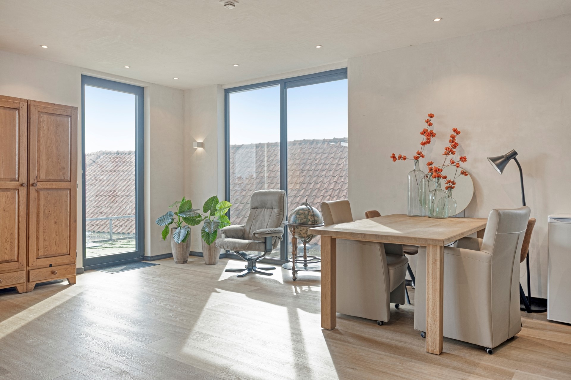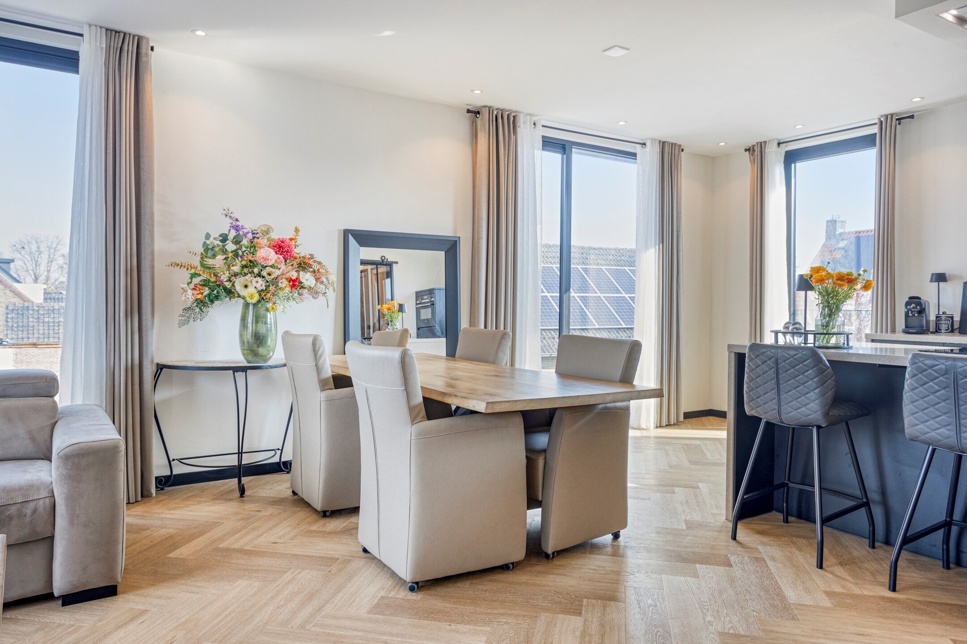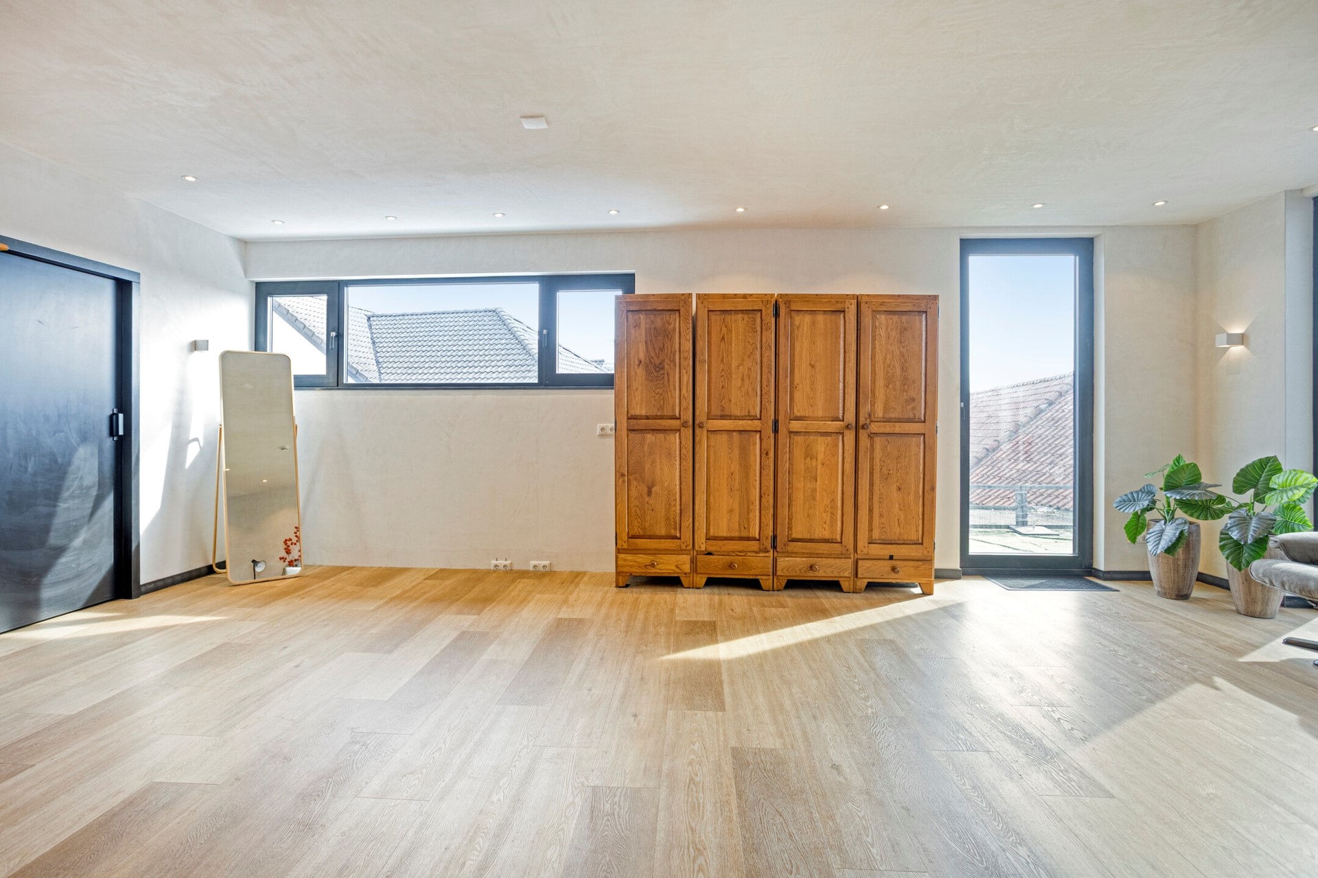 • Riante woonkamer met grote raampartijen en een toegangsdeur naar het plat dak. In deze ruimte ligt eveneens een pvc-vloer van lamellen die doorloopt over dit deel van het penthouse.