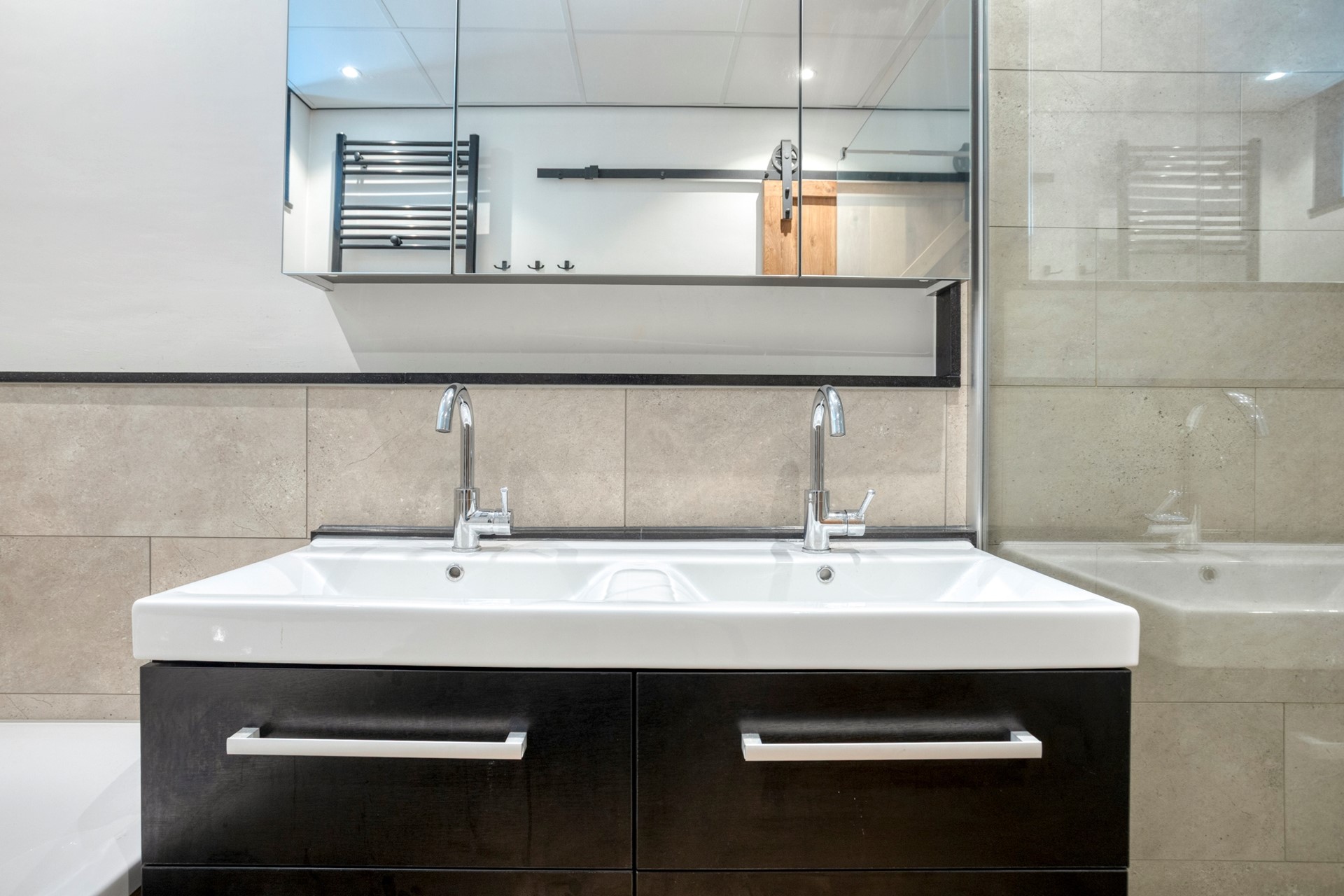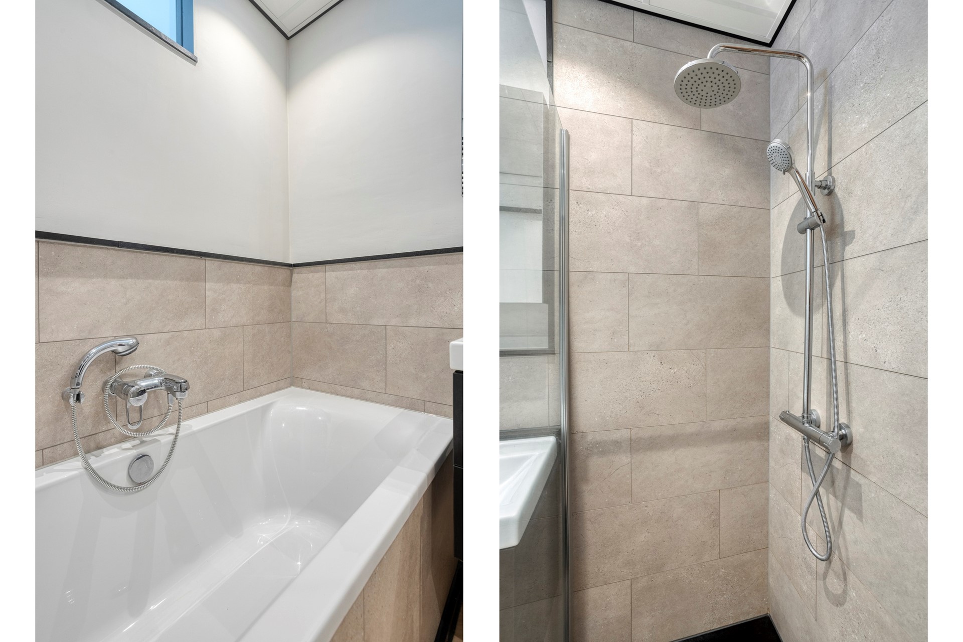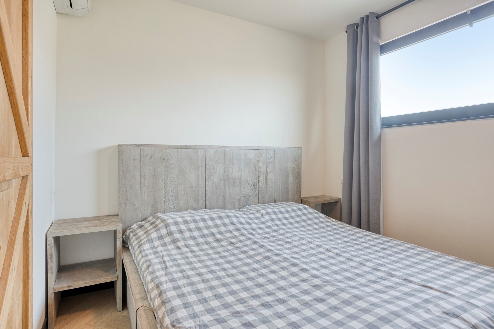• Badkamer en slaapkamer: de badkamer is deels betegeld en voorzien van een ligbad, inloopdouche, designradiator en een wastafel met wastafelmeubel en spiegelkastje. In de badkamer mechanische ventilatie. Via een houten loftdeur toegang tot de slaapkamer. Een raam zorgt hier voor de lichtinval. Deze ruimte heeft een eigen airco voor verwarming/ koeling.