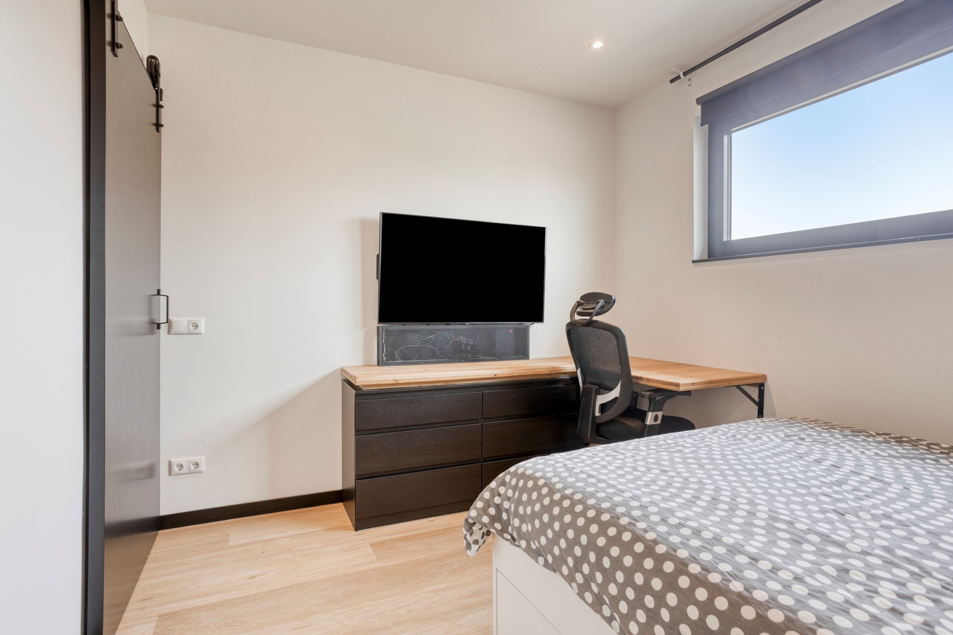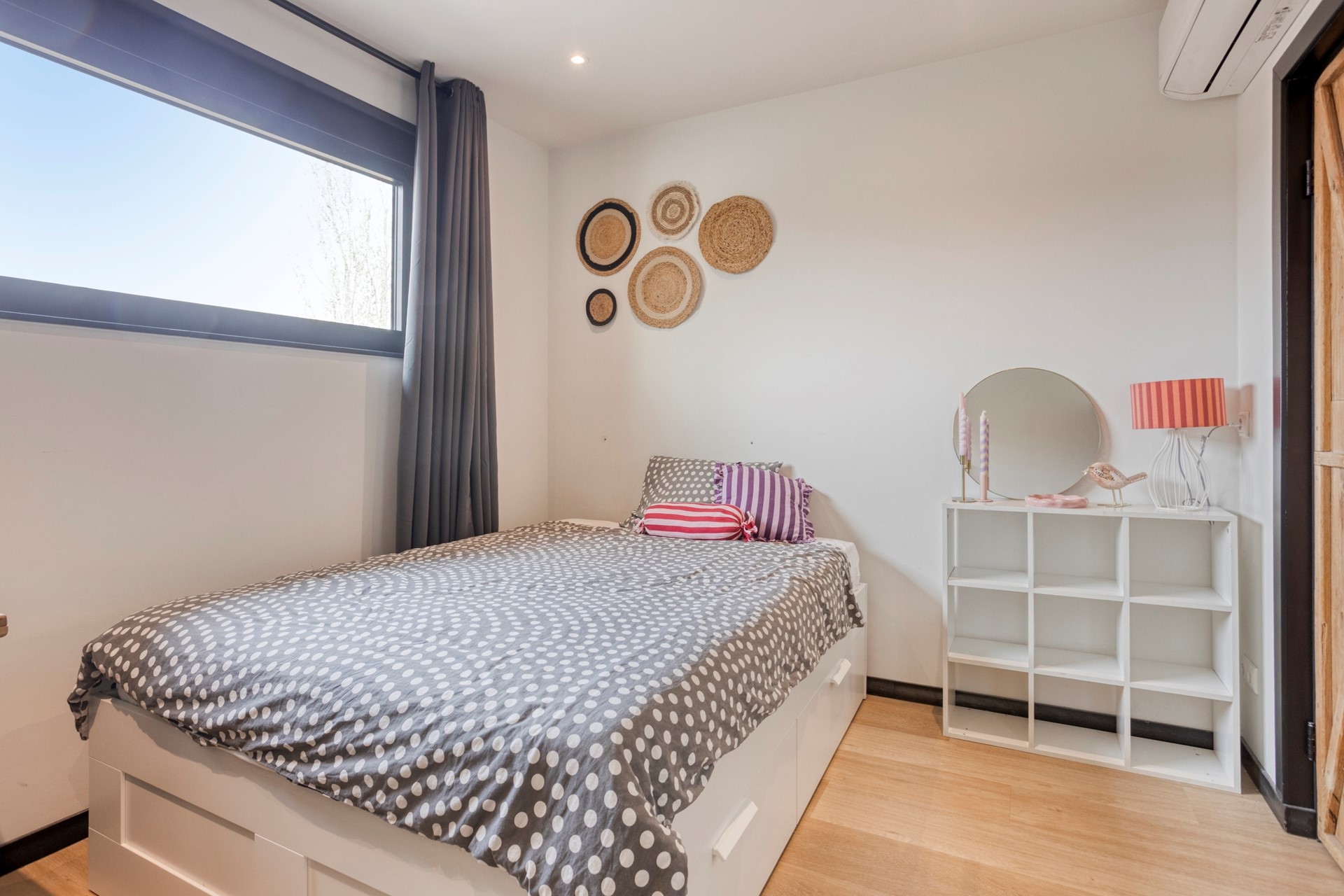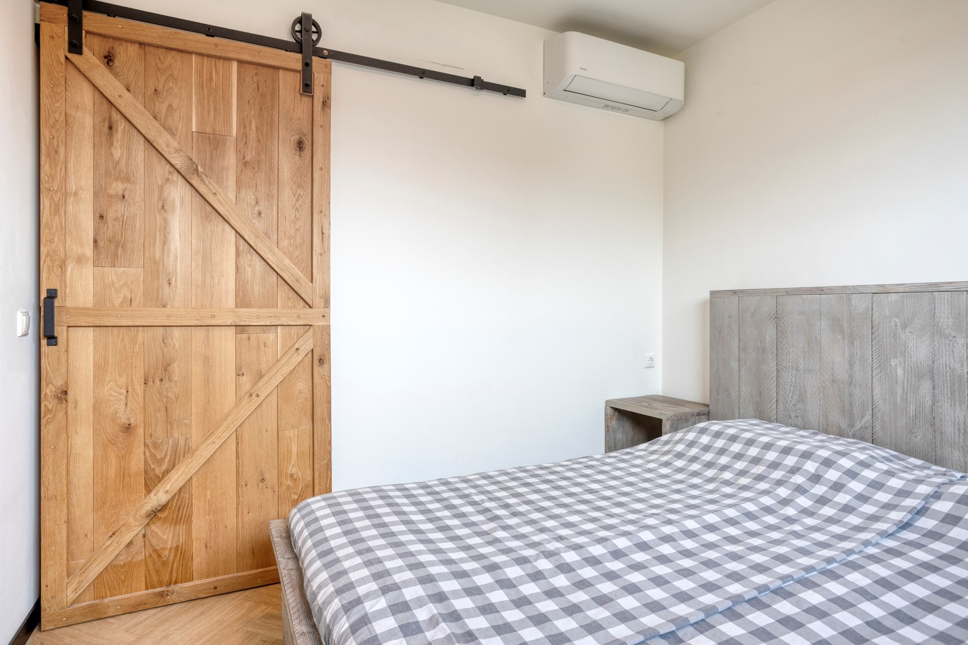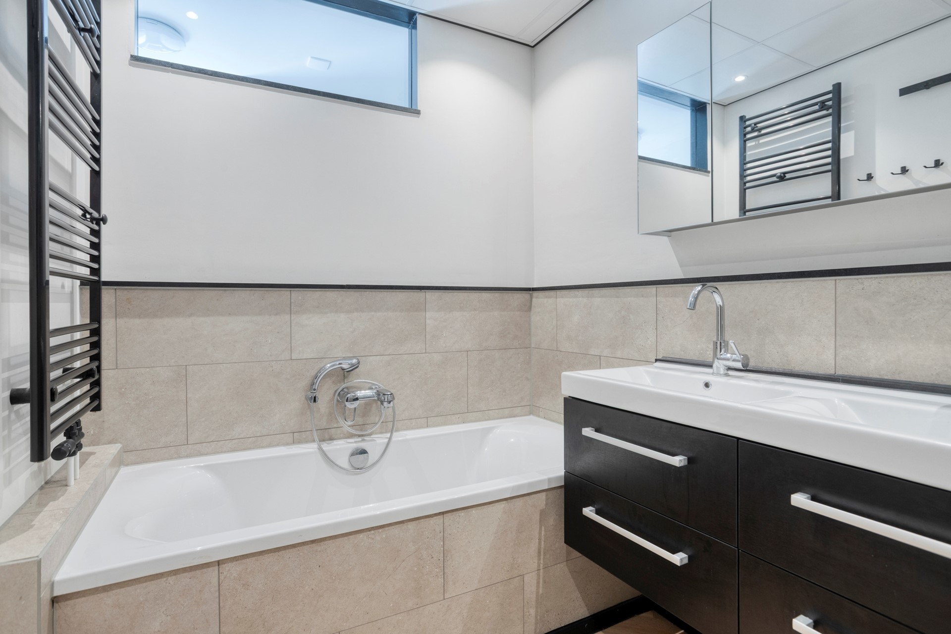 • Badkamer en slaapkamer: de badkamer is deels betegeld en voorzien van een ligbad, inloopdouche, designradiator en een wastafel met wastafelmeubel en spiegelkastje. In de badkamer mechanische ventilatie. Via een houten loftdeur toegang tot de slaapkamer. Een raam zorgt hier voor de lichtinval. Deze ruimte heeft een eigen airco voor verwarming/ koeling.