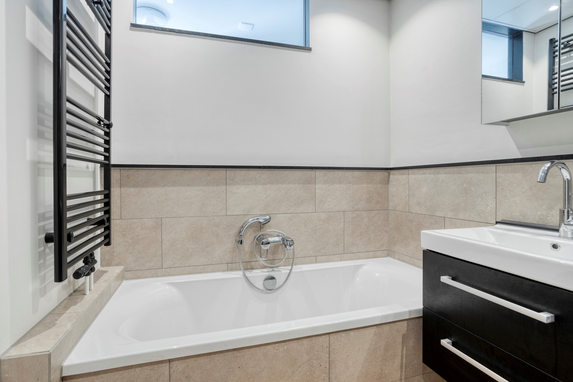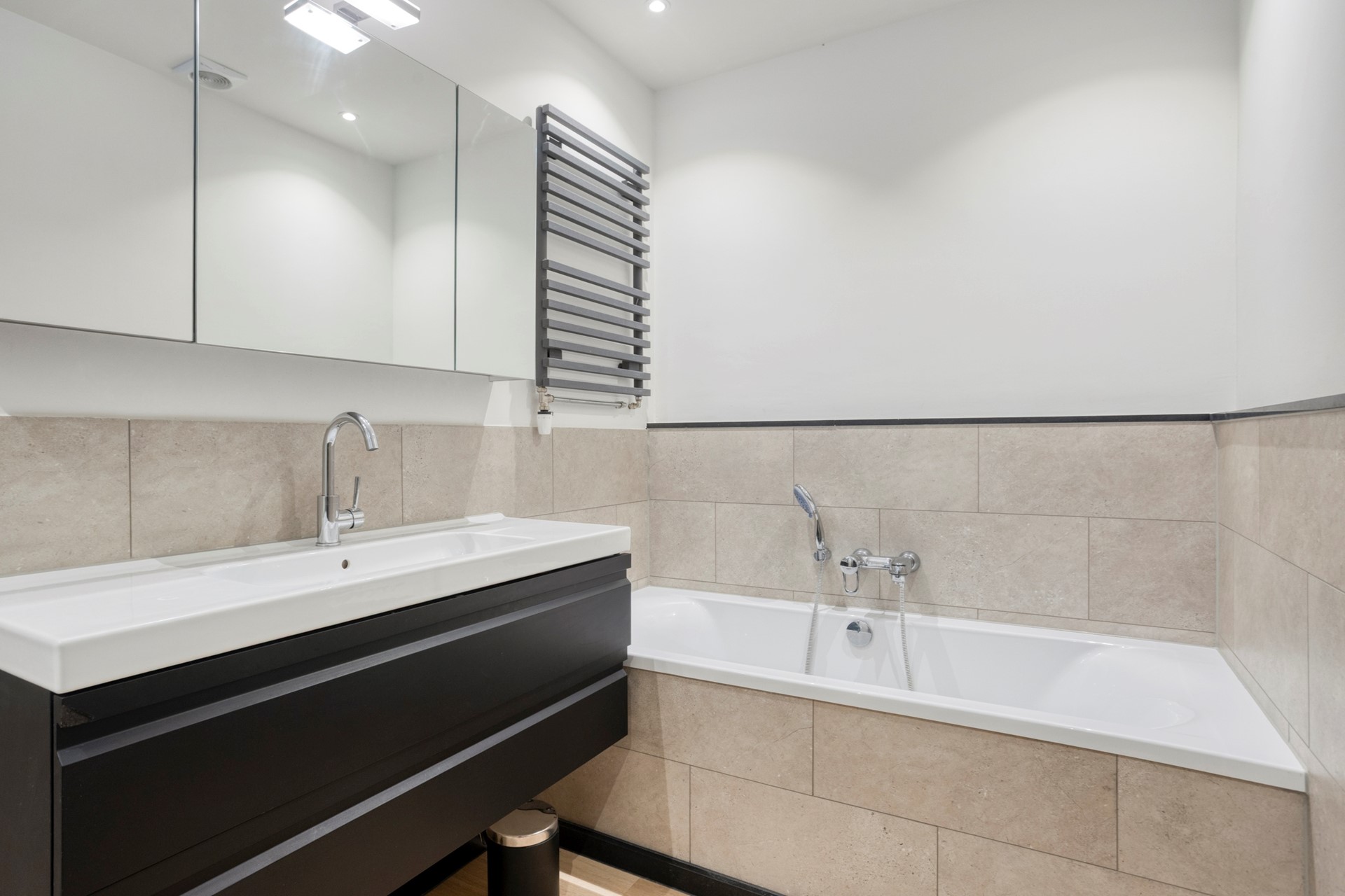 • Badkamer: deze badkamer is nagenoeg bijna gelijk qua afwerking als de andere badkamer: deels betegeld, ligbad, inloopdouche en een wastafel met wastafelmeubel en spiegelkastje. De badkamer heeft mechanische ventilatie.