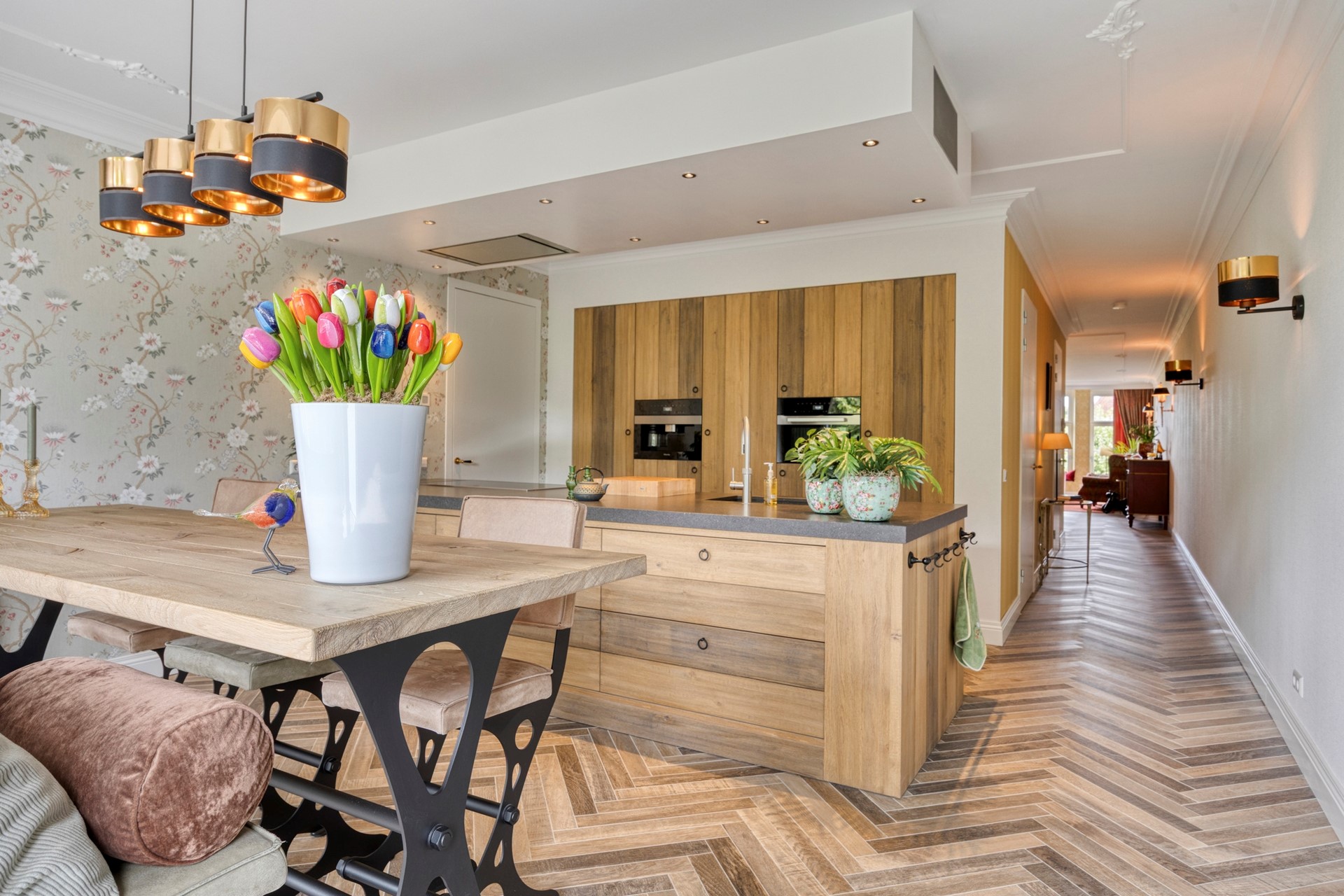 • Open keuken: schitterde op maat gemaakte exclusieve keuken met kookeiland en complete inrichting, vele lades, kastjes, een natuurstenen werkblad en geïntegreerde apparatuur zoals o.a.: combimagnetron, inductiekookplaat met afzuigkap, quooker, vaatwasser, extra grote koelkast, vriezer en een geïntegreerd koffiezetapparaat. Ook hier langs het plafons gips-sierlijsten. Via de keuken toegang tot het balkon