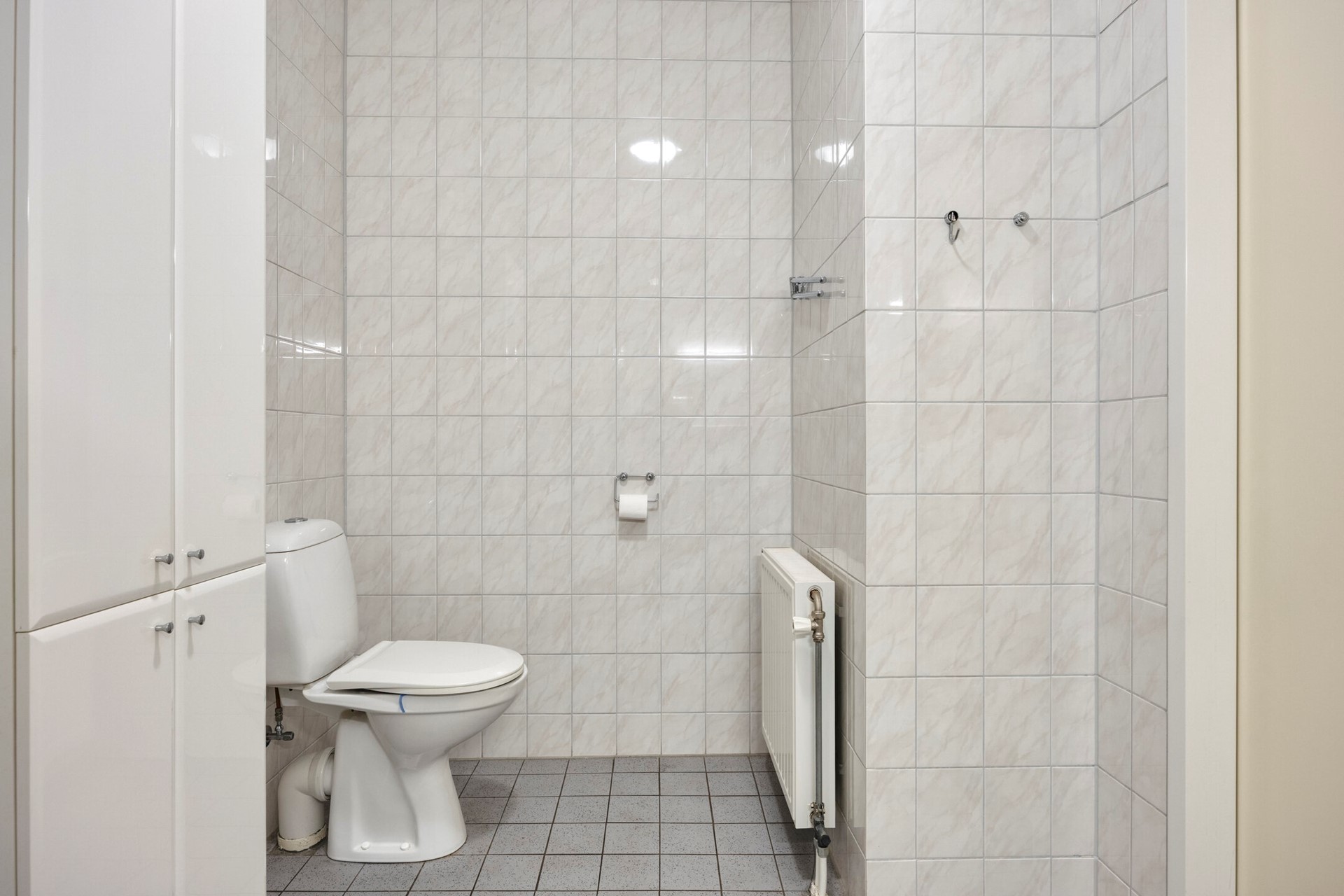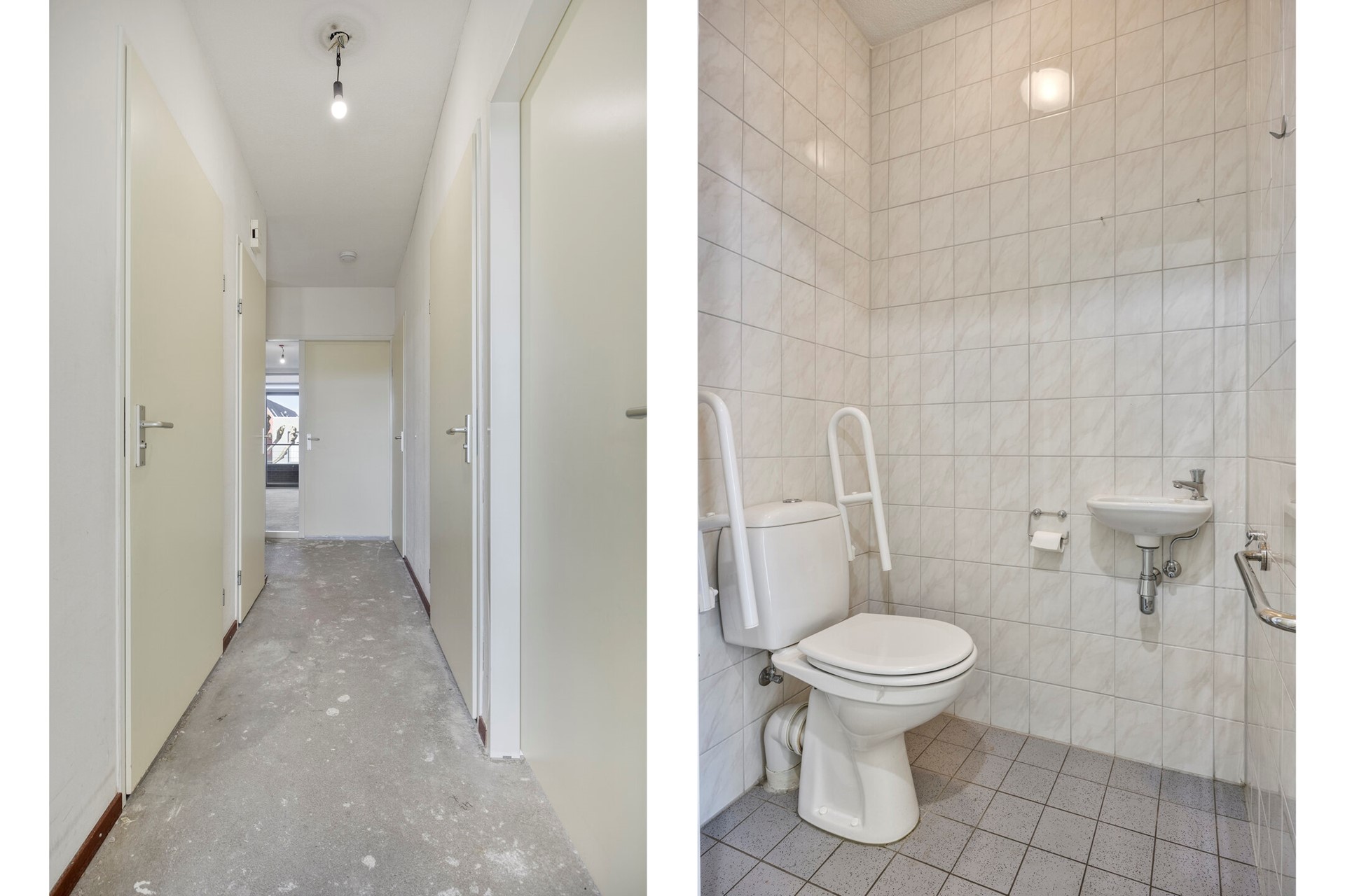 In de afgesloten galerij de ingang naar het appartement. Royale L-vormige hal met garderobe. In verlengde van de hal de bijkeuken (technische ruimte) met de HRE combi-cv Intergas (2019) en het centrale afzuigsysteem. Aansluitend de volledig betegelde toiletruimte met staand closet en fonteintje. Aan de rechterzijde is de meterkast (6 groepen/ 2x aardlek) en de riante badkamer van ca. 6,2m² met douchecabine, wastafel met planchet en spiegel, badkamerkast en staand closet. Geheel achter bij het appartement een 2-tal riante slaapkamers, beide met openslaande deuren (met plissédeur) en groot ca. 18,6m² en 13,7m². Aansluitend het balkon (dakterras).