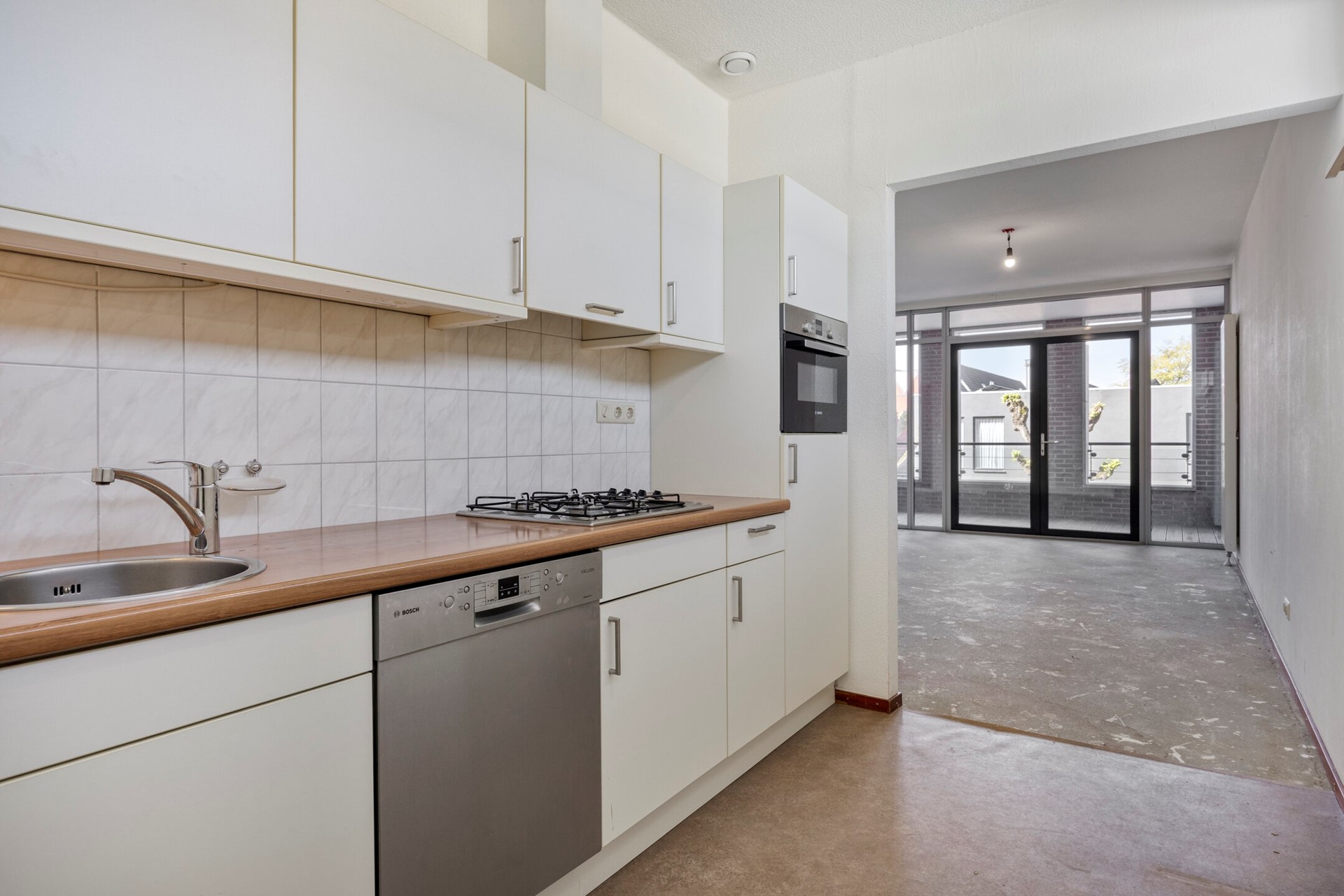 Zeer ruim opgezette woonkamer ligt aan de straatzijde met aan bij het balkon 2x openslaande deuren naar het balkon. Deze voorzijde is volledig van glas hetgeen bijdraagt aan een ruimte geheel. Het balkon heeft een houten, geprofileerde, vloerafwerking. In de open keuken een recht keukenmeubel met de volgende apparatuur: Combimagnetron, gaskookplaat met afzuigkap, vaatwasser, spoelbak en koelkast. Berging: aan de achterzijde is de gang naar het trappenhuis en de daar gelegen berging (ca. 3,13 x 2,43m).